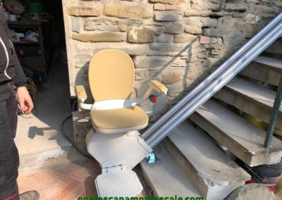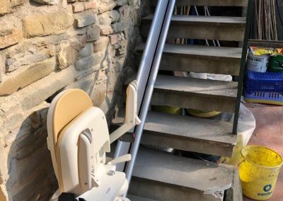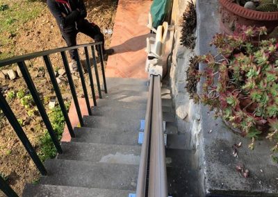 Siamo in questo caso di fronte ad un impianto un po’ particolare poiché si tratta di un montascale installato in ambiente esterno: per la precisione si tratta di un servoscala a poltrona rettilineo.