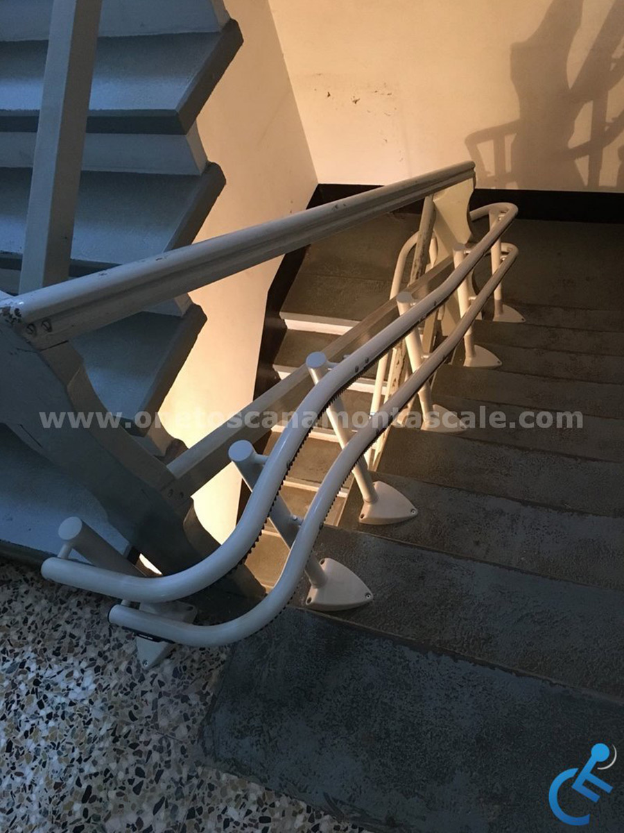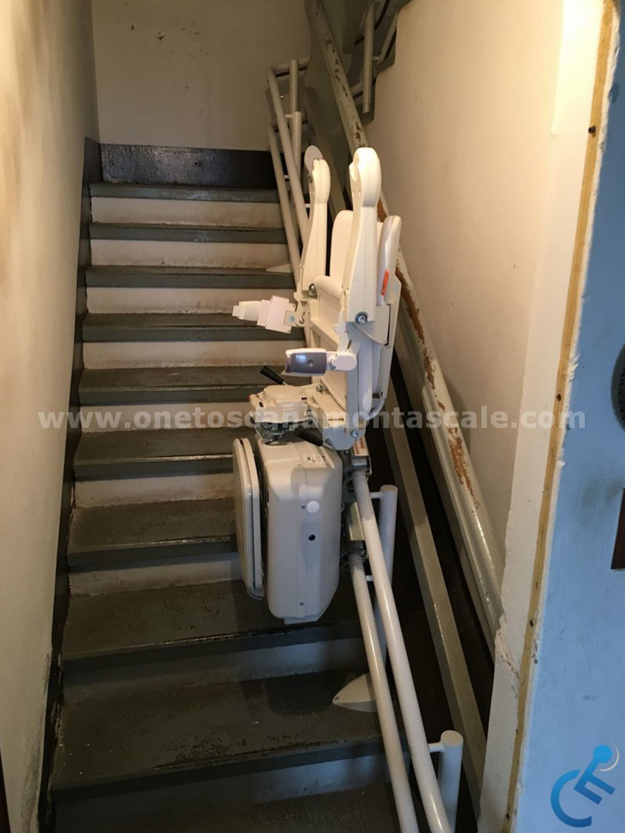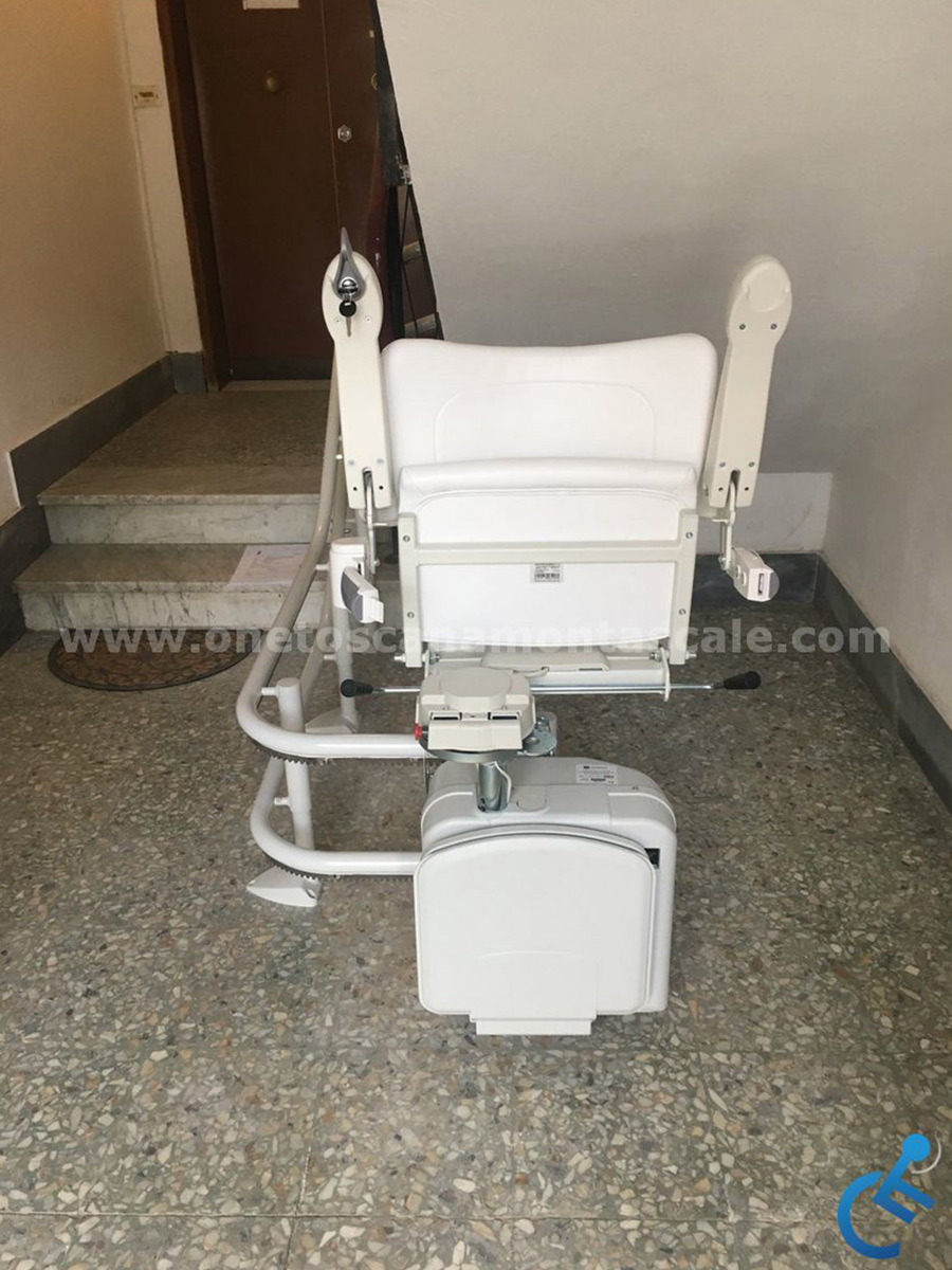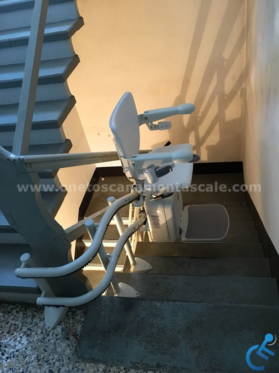 In questo caso vi mostriamo un esempio di installazione di montascale a poltroncina (il classico montascale per anziani) eseguita presso uno studio odontoiatrico.
