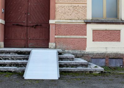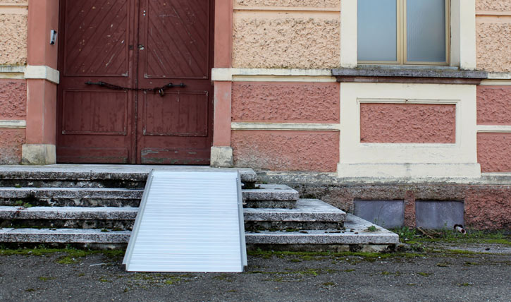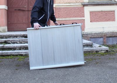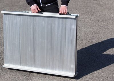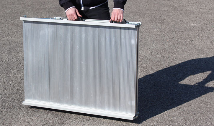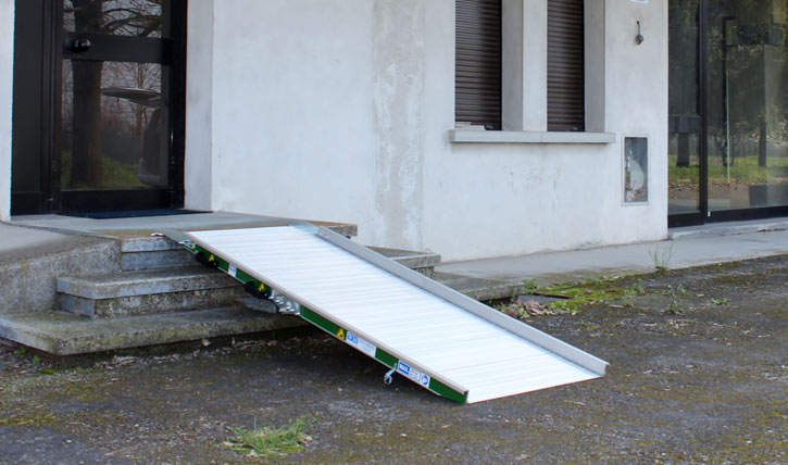 Rampa mobile che lavora in appoggio e non richiedo alcun montaggio, richiudibile e compatta. Facile da trasportare grazie alla presenza di 2 maniglie e 4 ruote.